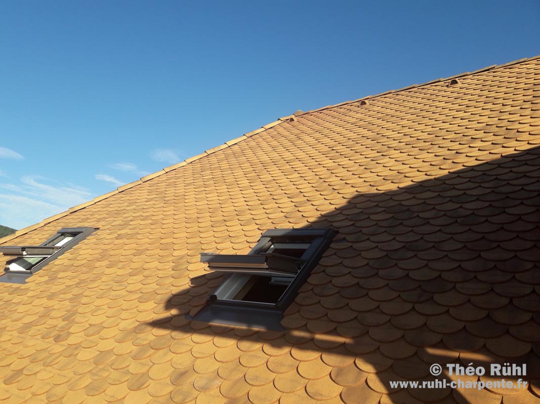 Couverture Tuille-ecaille-Obiou-et-Chatel Couverture-neuve-et-velux Bac acier Bac acier et faîtage a boudin Arboises écailles Tuiles écailes, et Arboises écailles Découpe de tuiles dans une noue Membron de jonction entre deux couvertures différentes Work in progress Noue en zinc avant couverture Couverture en tuiles écailles panachées Tuiles écailles panachées Tuiles écailles panachées Avant la mise en place des tuiles Toiture mixte, tuiles écailles panachées en haut et tuiles Terreal Santenay en bas Rencontre de croupe